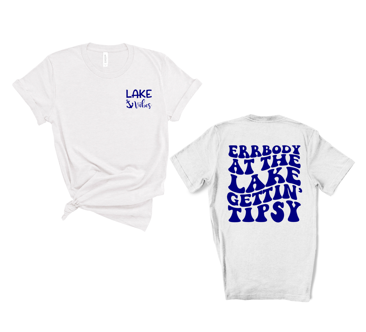 Get ready to turn heads at the lake with our Errbody At The Lake Getting Tipsy Shirt. This fun and catchy design is perfect for lake trips, and the shirt is both comfortable and stylish. Don't miss out on this must-have addition to your summer wardrobe! This is on a Bella Canvas T-shirt with dark blue words. This is made to order.